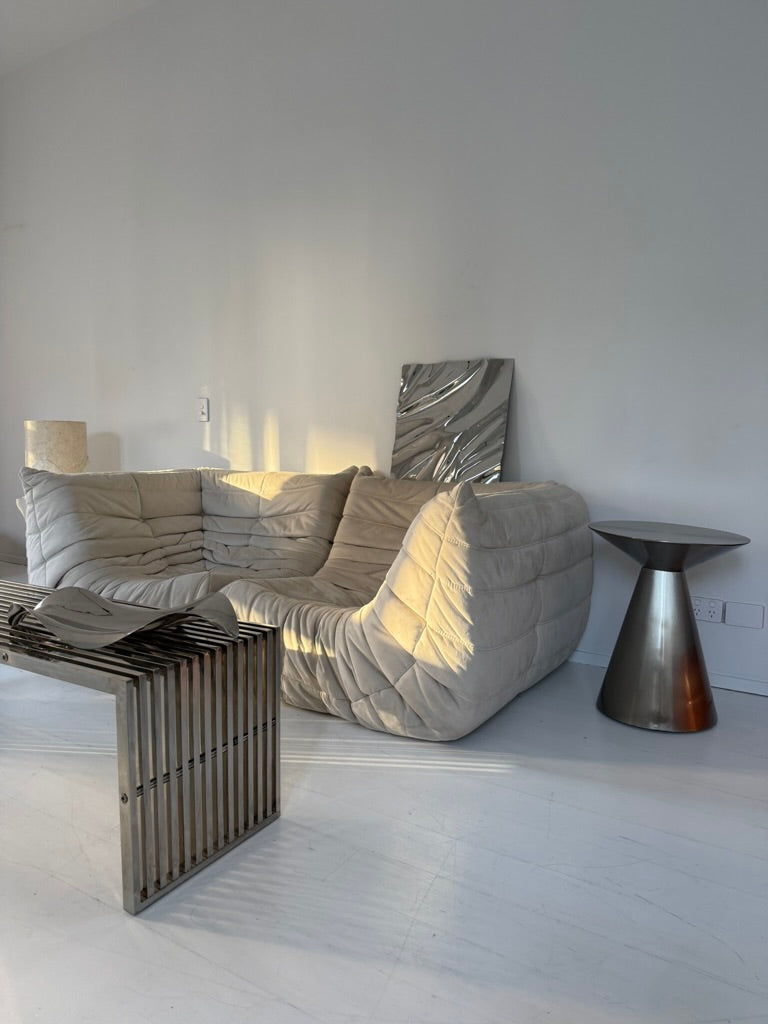 Hand-crafted from polished stainless steel with a distinct crushed surface, each canvas reflects its surroundings in a warped, liquid-like mirror finish. When mounted, it ‘floats’ off the wall, catching and refracting light in constant motion — an ever-evolving work of art.